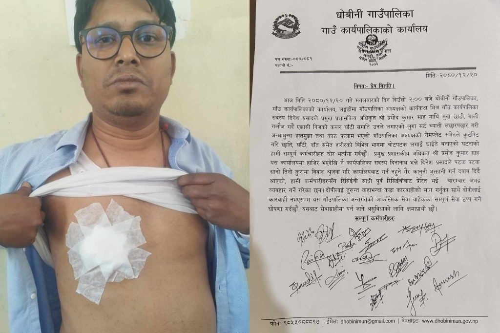 गाउँपालिका कार्यालय मै प्रमुख प्रशासकिय अधिकृत साहलाई मंगलबार दिउसाे गाउँ कार्यपालिका सदस्य दिनेश प्रसाद कलवाहरले गाउँपालिका अध्यक्षकाे नेम प्यलेटले हिर्काउनुकाे साथै कुटपिट समेत गरेकाे कर्मचारीहरुले वताएका छन् । कुटपिट गर्ने गाउँ कार्यपालिका सदस्य कलवारलाई प्रहरी नियन्त्रणमा समेत लिएकाे छ । घाइते अधिकृत साहकाे छातीमा गम्भिर चाेट लागेकाे छ ।
