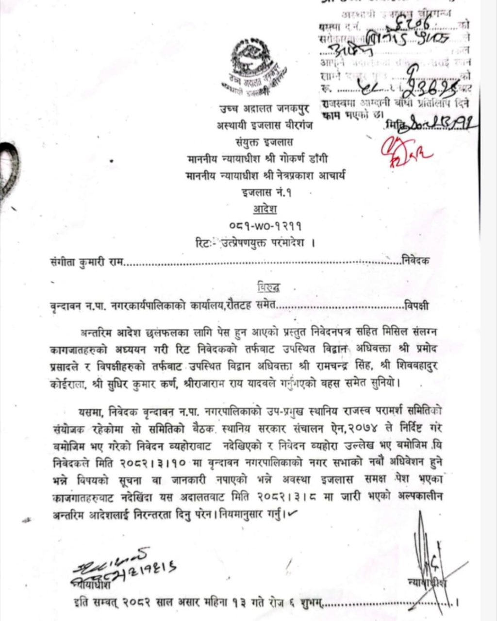 उपप्रमुख रामले गत ८ गतेका दिन नगरसभा तत्काल स्थगित गर्न अदालतमा उत्प्रेषणयुक्त परमादेशको माग गरेपछि अदालतले वृन्दावन नगरपालिकाको कार्यालय समेतलाई विपक्षी बनाउँदै पालिका कार्यालयको नाममा नगरसभा नगर्न अन्तरिम आदेश जारि गरेको थियोे।