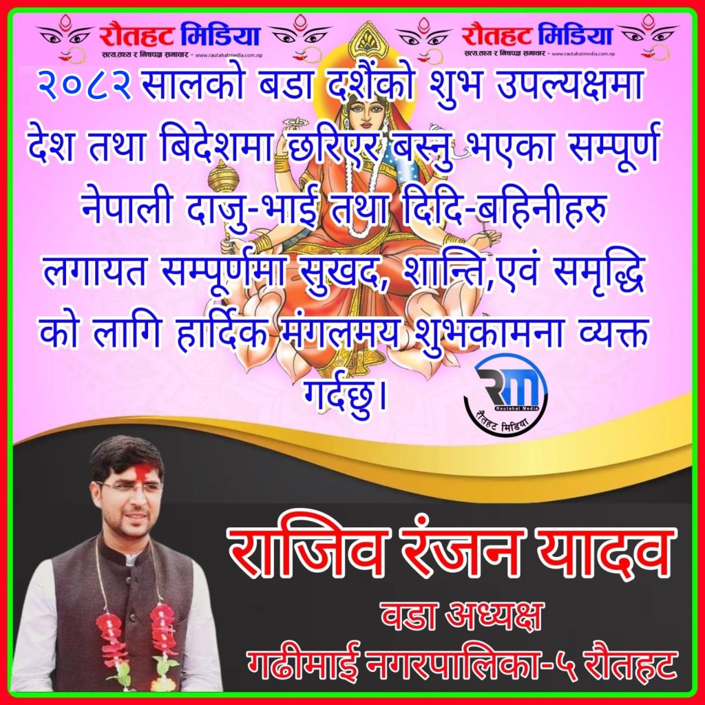 बडा दशैको हार्दिक शुभकामना। Continue Reading Previous चन्द्रज्योति कान्ति हस्पिटल प्राली को तेस्रोवार्षिकोत्सबको अवसरमा एक दिने नि:शुल्क विशेषज्ञ स्वास्थ्य शिविर सम्पन्न भएको छNext बिश्वकर्मा पूजाको हार्दिक शुभकामना Leave a Reply Cancel replyYour email address will not be published. Required fields are marked *Comment * Name * Email * Website Save my name, email, and website in this browser for the next time I comment. More Stories मधेश प्रदेश निर्वाचन प्रहरी रौतहट जिल्लाका चार स्थानबाट आवेदन २ माघ २०८२, बिहीबार ०४:१५ Sunil Kumar मधेश प्रदेश रौतहटमा पहिलो पटक अत्याधुनिक फेको मेसिन र टोपिकल सेवा सुरू २९ कार्तिक २०८२, शुक्रबार १४:२९ Sunil Kumar 1 min read बिज्ञान मधेश प्रदेश नि:शुल्क सिपमुलक तालिम सम्बन्धि जय किसान बहुप्राविधिक शिक्षालय धरहरी को एक जरुरी सूचना। २३ आश्विन २०८२, बिहीबार १३:४५ Sunil Kumar
