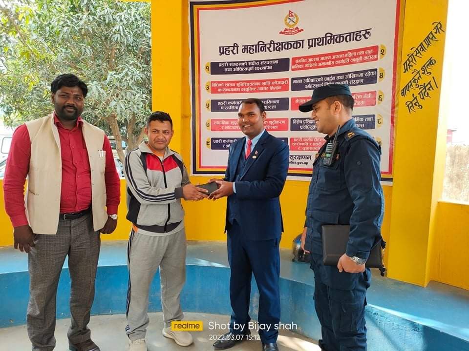 केहि दिन देखि हराएको मोबाईल सम्बन्धित मानिसलाई जिम्मा लगाएका छन ।रुकुम जिल्लाको खलङ्गा घर भई बस्ने प्रेम बहादुर बिकको ईन्फीनिक्स मोबाईल गत शनिबार हेराएको थियो ।रौतहट जिल्लाको गढीमाई नगरपालिकाको वार्ड नं.९ मलाहिटोल बस्ने तथा सानिमा लाईफ ईन्सोरेन्स कम्पनी शाखा चन्द्रनिगाहपुरका शाखा प्रमुख साथै समाजिक अभियन्ता शिवचन्द्र प्रसाद साहले आफ्नो साथीलाई सिमरा एयरपोर्टमा छोडन जादा सो मोबाईल बाटोमा भेटिएको थियो ।भेटिएको मोबाईललाई सोधपुछ गरि पता लागेपछि मोबाईल धनीलाई रौतहट जिल्लाको गरुडा नगरपालिका स्थित रहेको गरुडा ईलाका प्रहरी कार्यलयमा बोलाई सम्बन्धीत ब्यतिmको कागजात चेकजाच गरि र बास्तबिता बुझिई ईलाका प्रहरी कार्यलय गरुडाका प्रहरी नायब उपरिक्षक डिएसपि श्री राम भण्डारी र जसपा चर्चित युवा नेता राजकुमार दासको रोहबरमा सानिमा लाईफ ईन्सोरेन्सका शाखा प्रमुख शिवचन्द प्रसाद साहले आफ्नो हाथले नेपाल सरकारको सेवक पनि रहनु भएका सशस्त्र प्रहरी प्रेम बहादुर बिकलाई हस्तान्तरण गरेका छन ।हस्तान्तरण गर्ने क्रममा साहले भने समाज एक सुख दुखका साथ हुन सबैसंग सबैको आवश्यकता हुन्छ ।त्यस कारण समाजमा कसैको कुनै ठुलो वा सानो कुरा हराए पनि त्यो समाग्री आफ्नो ठाउँमा नराखी सम्बन्धीलाई दिदा ठुलो पुन्यको कुरो रहेको उहाँले बताए ।मानव नै धर्म हो भनि भनाई सबैलाई अवगत नै हो त्यस कारण आफ्नो जुन कर्म हो त्यो गर्दै जादा धेरै ठुलो धर्म हो साहले बताए ।