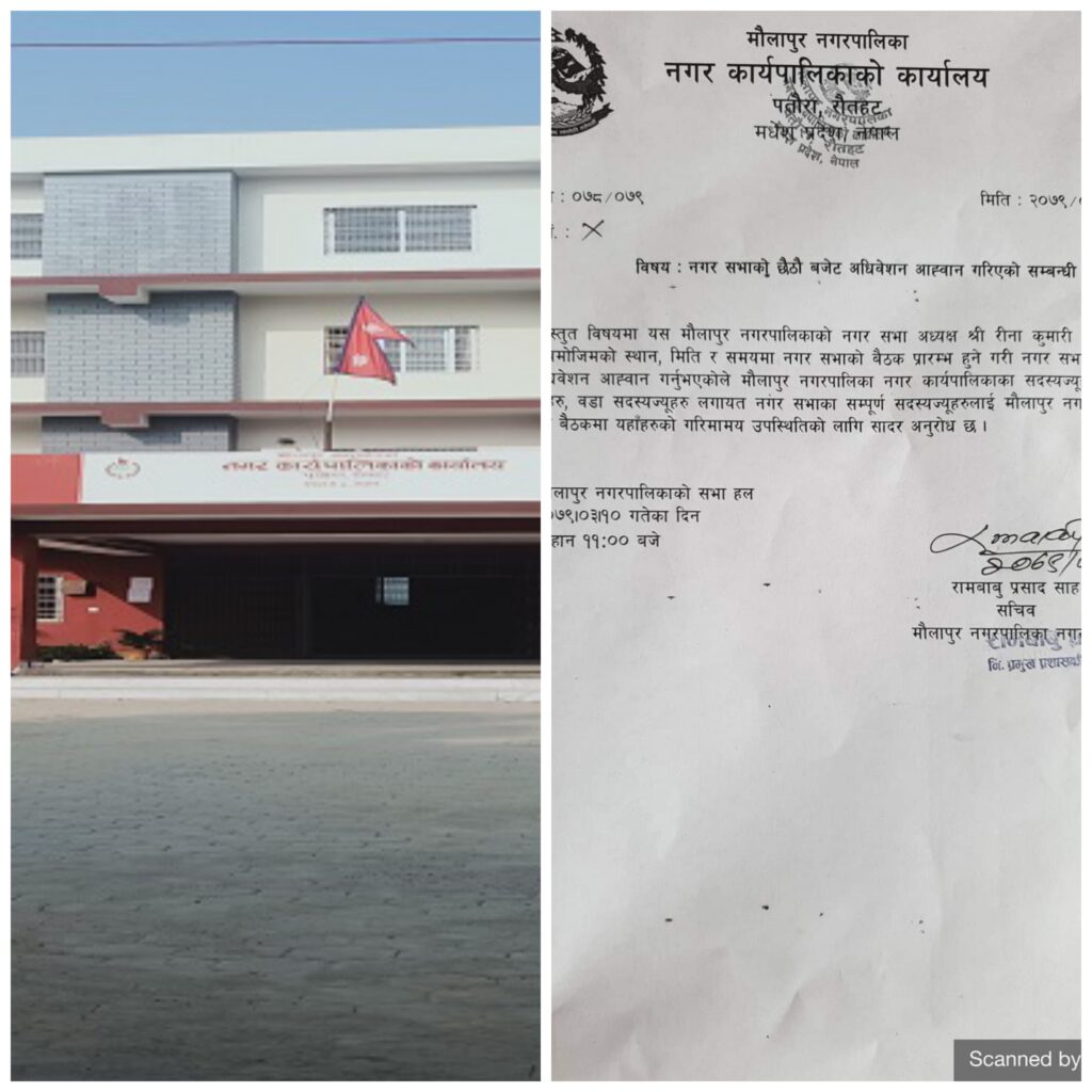 रौतहटको मौलापुर नगरपालिकाको नगर अधिवेशन असार १० मा आह्वान भएको छ । मौलापुर नगरपालिका नगर कार्यपालिकाको कार्यालय पतौराले आगामी आर्थिक वर्षको लागि बजेट अधिवेशनको रुपमा चिनिने नगर सभाको छैटौँ बजेट अधिवेशन असार १० मा आह्वान गरिएको हो । नगर प्रमुख रिनाकुमारी साह असार १० मा नगरको बजेट आह्वान गरिएको जानकारी निमित्त प्रमुख प्रशासकीय अधिकृत रामबाबु साहले गराएका छन् । नगरसभाका सम्पूर्ण सदस्यलाई असार १० मा नगरपालिकाको सभाहलमा बिहान ११ बजे नगरसभाको लागि बोलाइएको हो । यसै गरी परोहा नगरपालिकाले पनि असार १० गते परोहा नगरपालिकाको सभाहलमा बिहान ११ बजे नगर प्रमुखको निर्देशनअनुसार नगर सभाहलमा आह्वान गरिएको प्रमुख प्रशासकीय अधिकृत महम्मद महफुुज अहमदले जानकारी गराएका छन् । असार १० मा नै पालिकाको नगरसभा हुने व्यवस्था रहेको छ ।